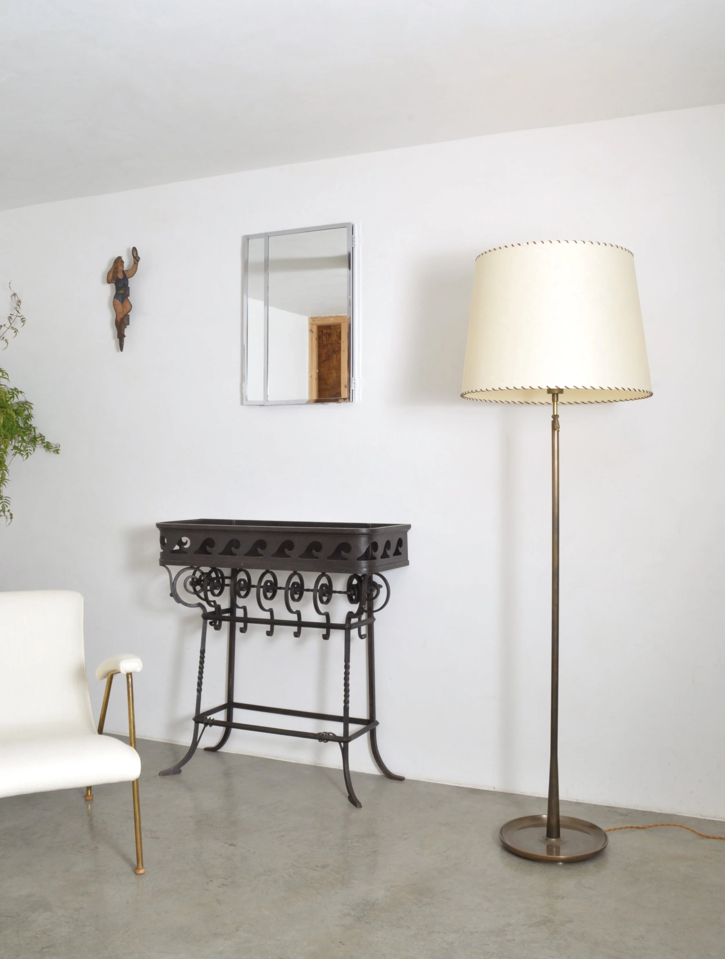 A great indoor/ outdoor table in well used Blue stone resting on a well aged galvanized steel base in the archetype 1930s tubular steel fashion.